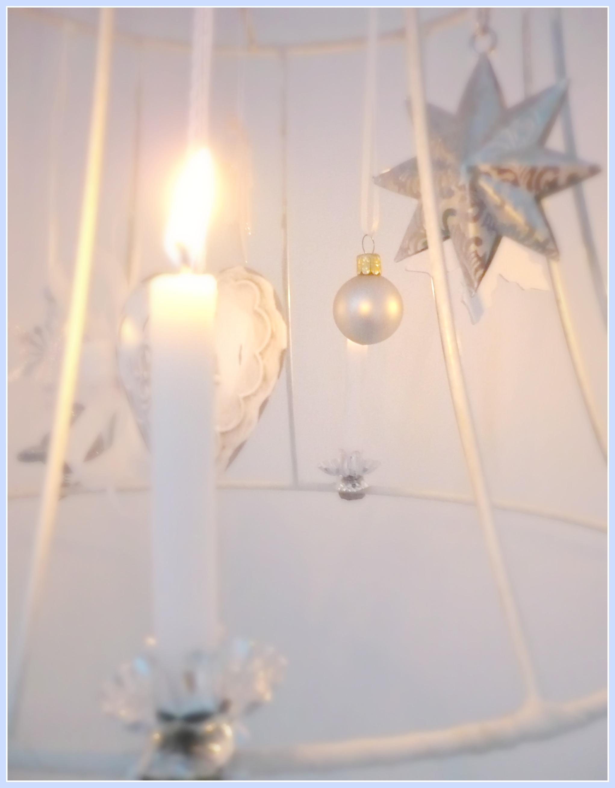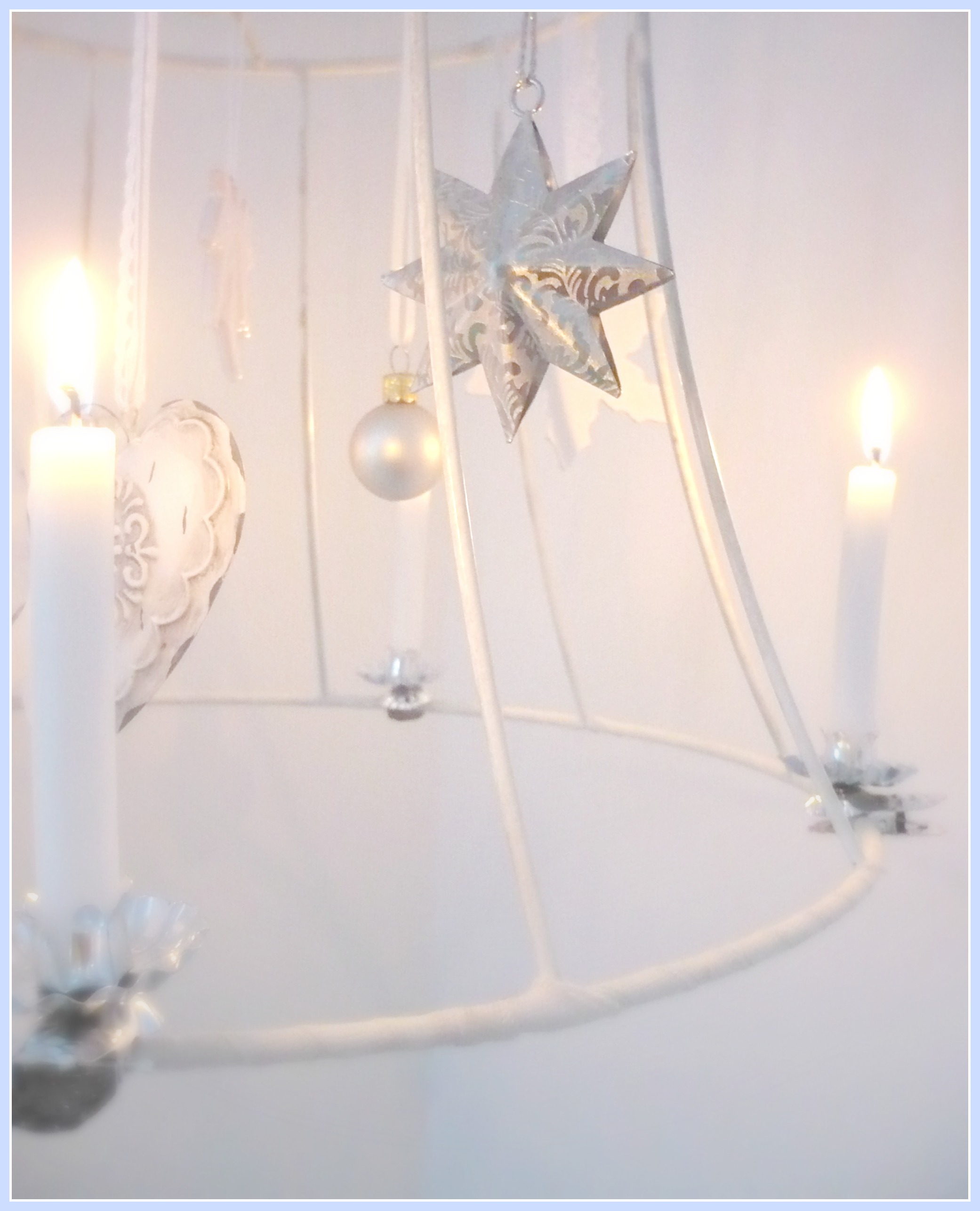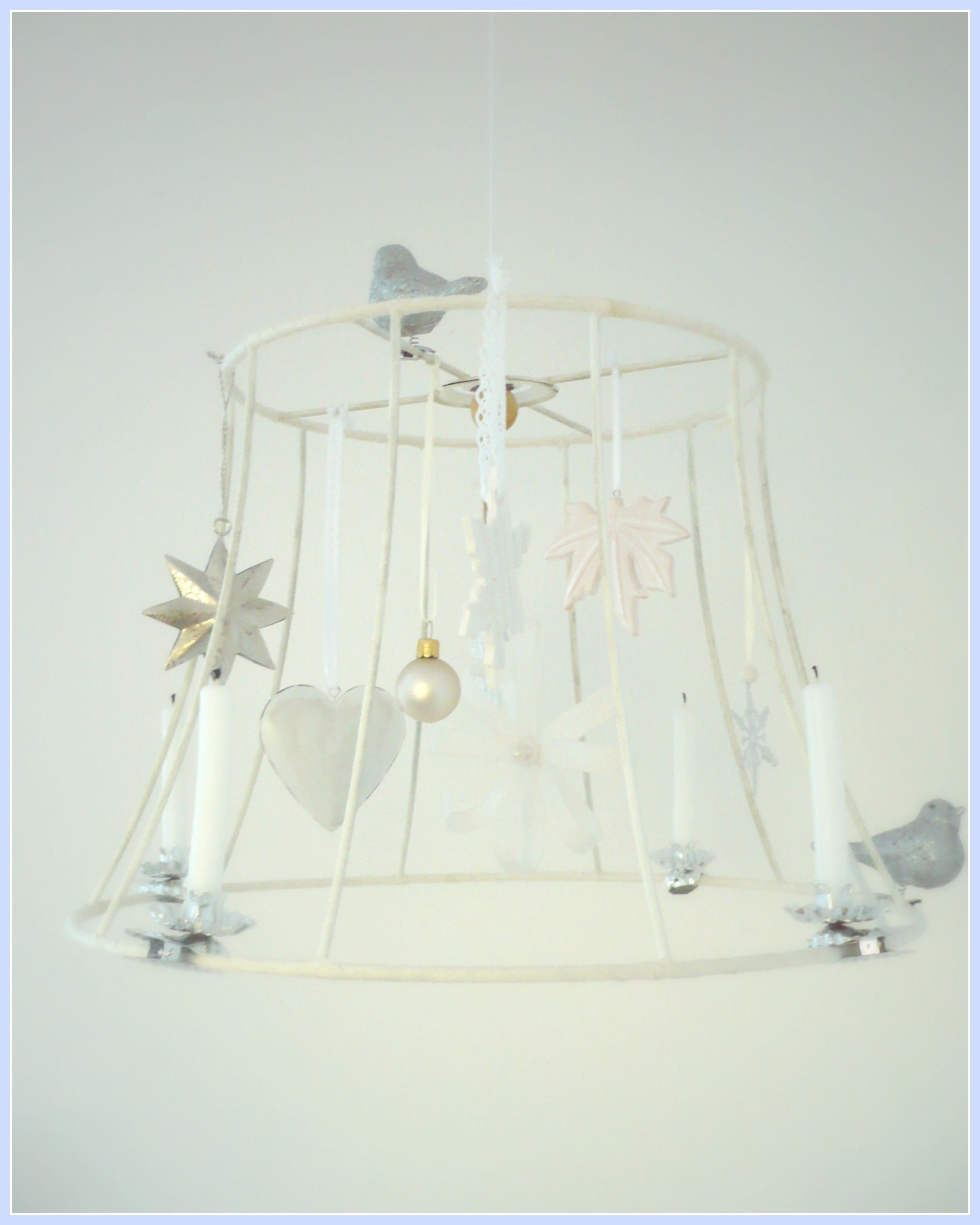 Also schnell den Schirm abgeschraubt, den Stoff entfernt und drauf los dekoriert. Verwendet habe ich 4 Christbaumkerzen samt Klammern und kleine weihnachtliche Anhänger. Die Lampe hängt an einer große Spitzenborte von der Decke. Wunderhübsch!