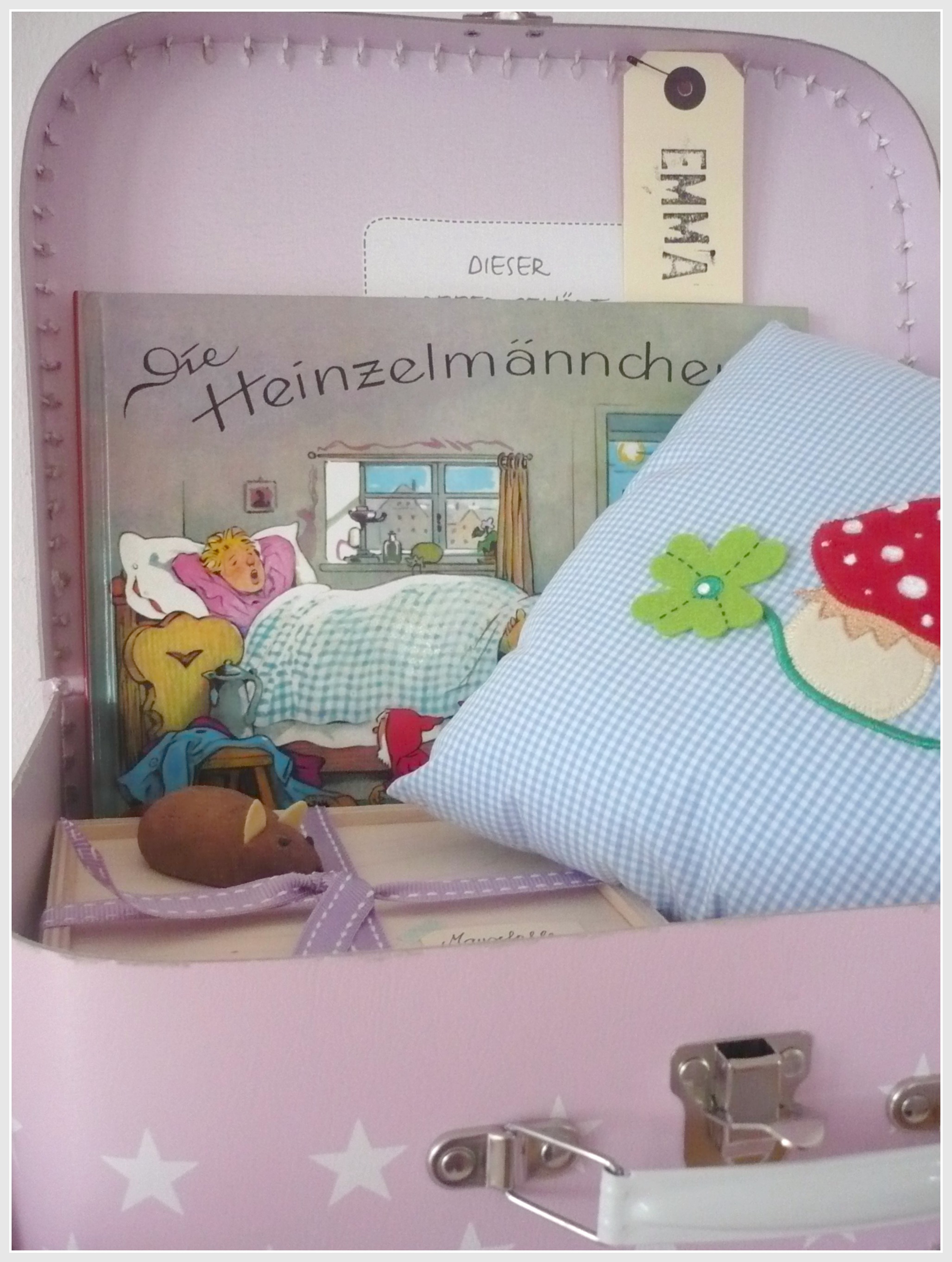 Köfferchen, Schmusekissen und Bücher habe ich im Online-Shop von Tausendkind gefunden.