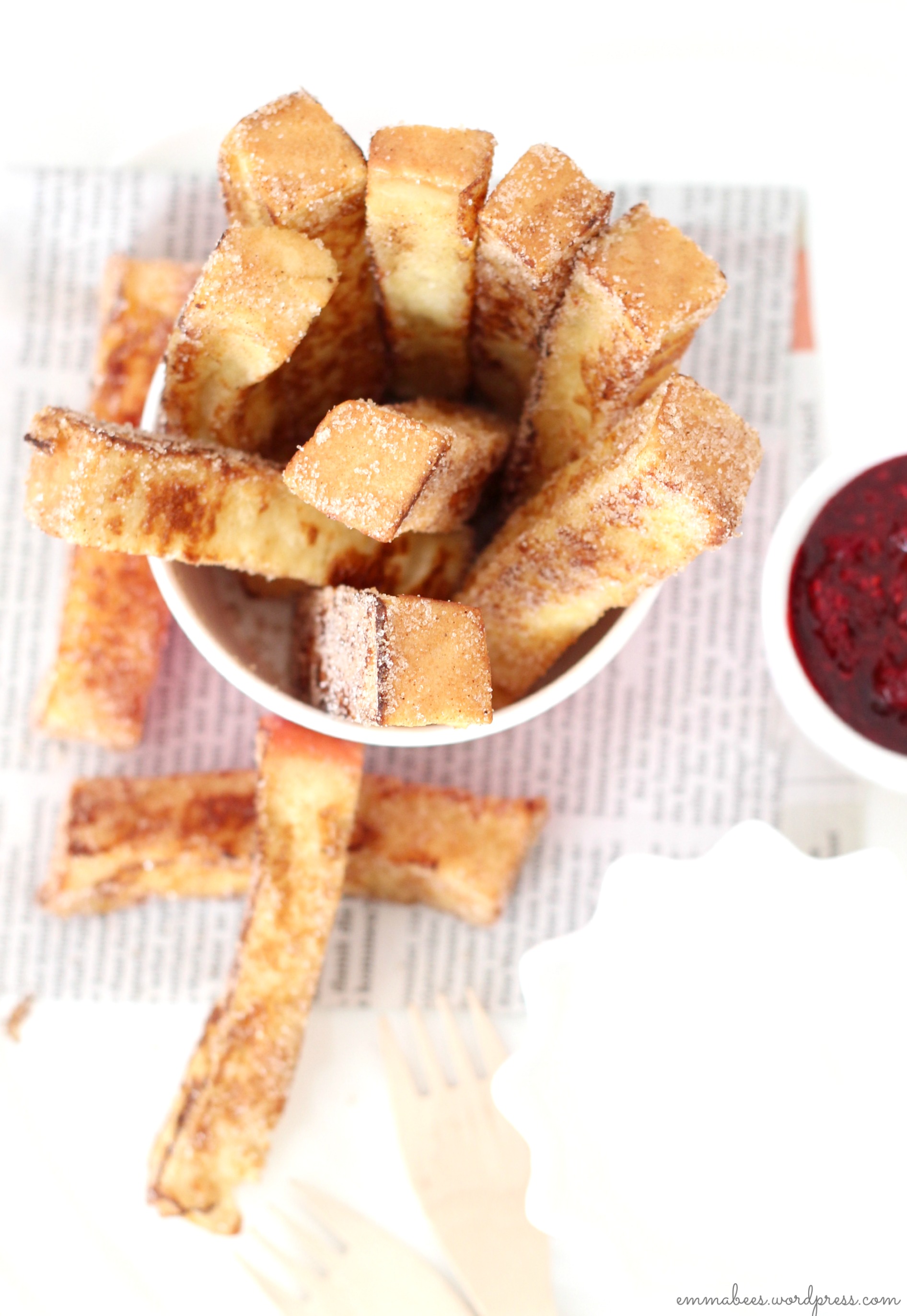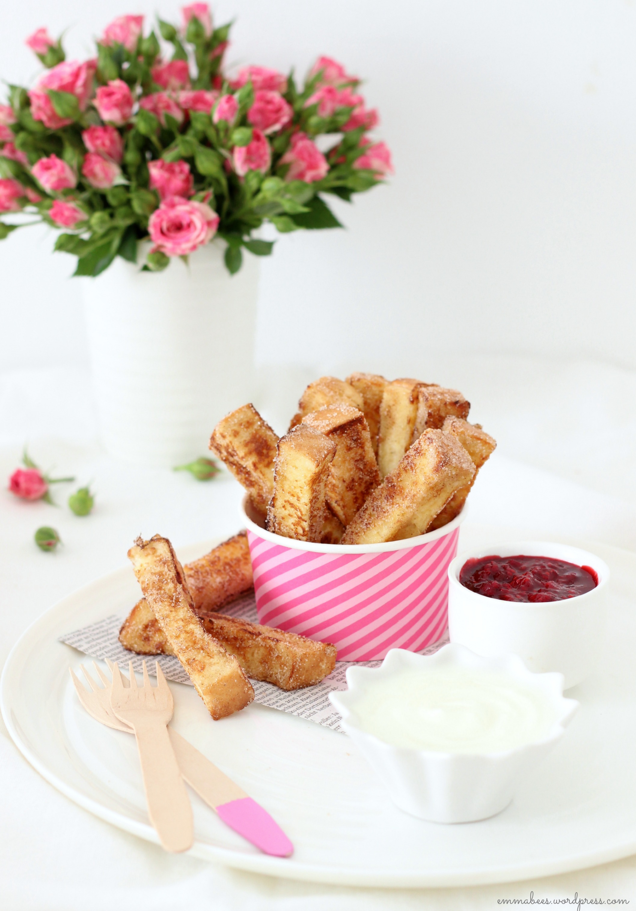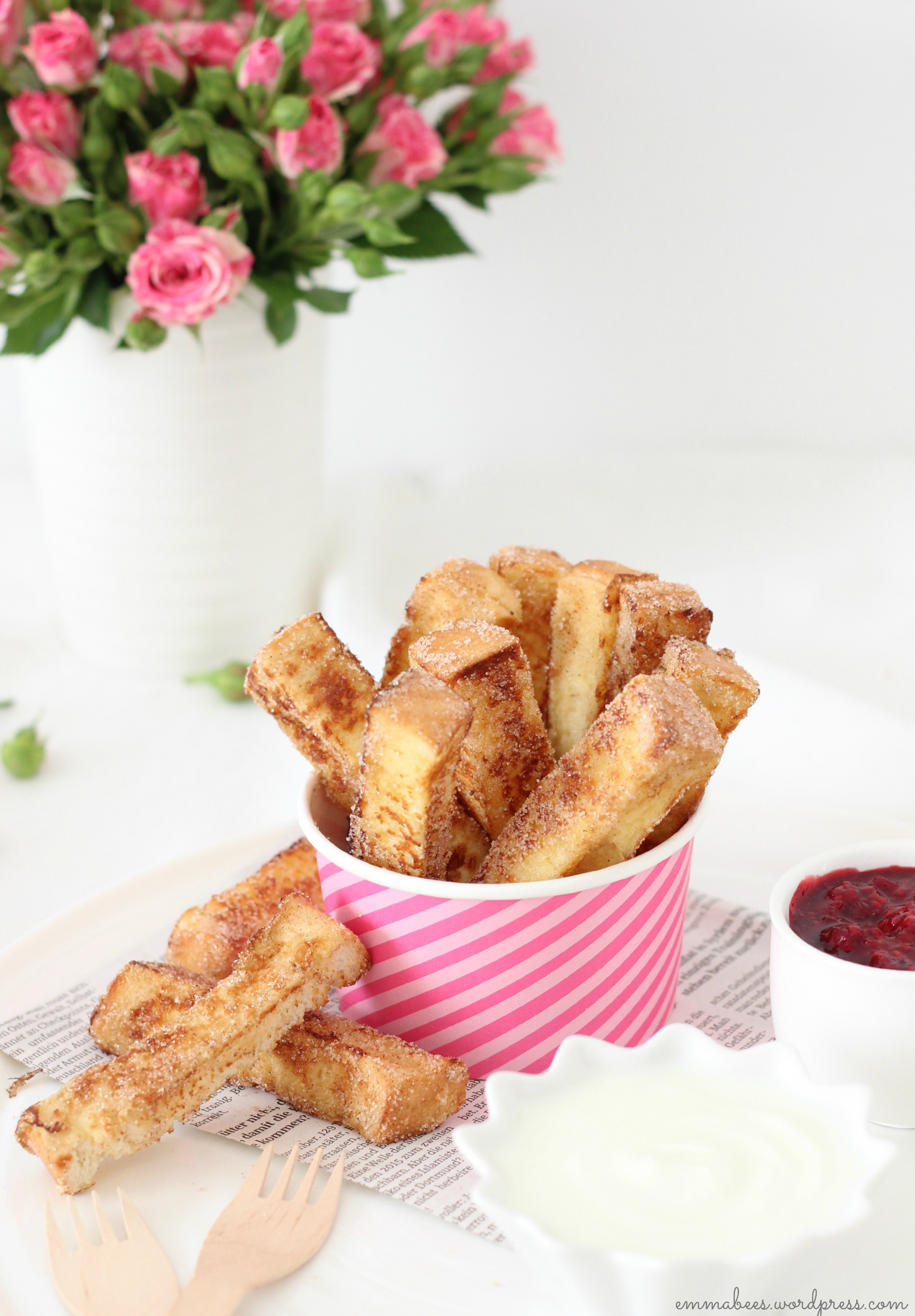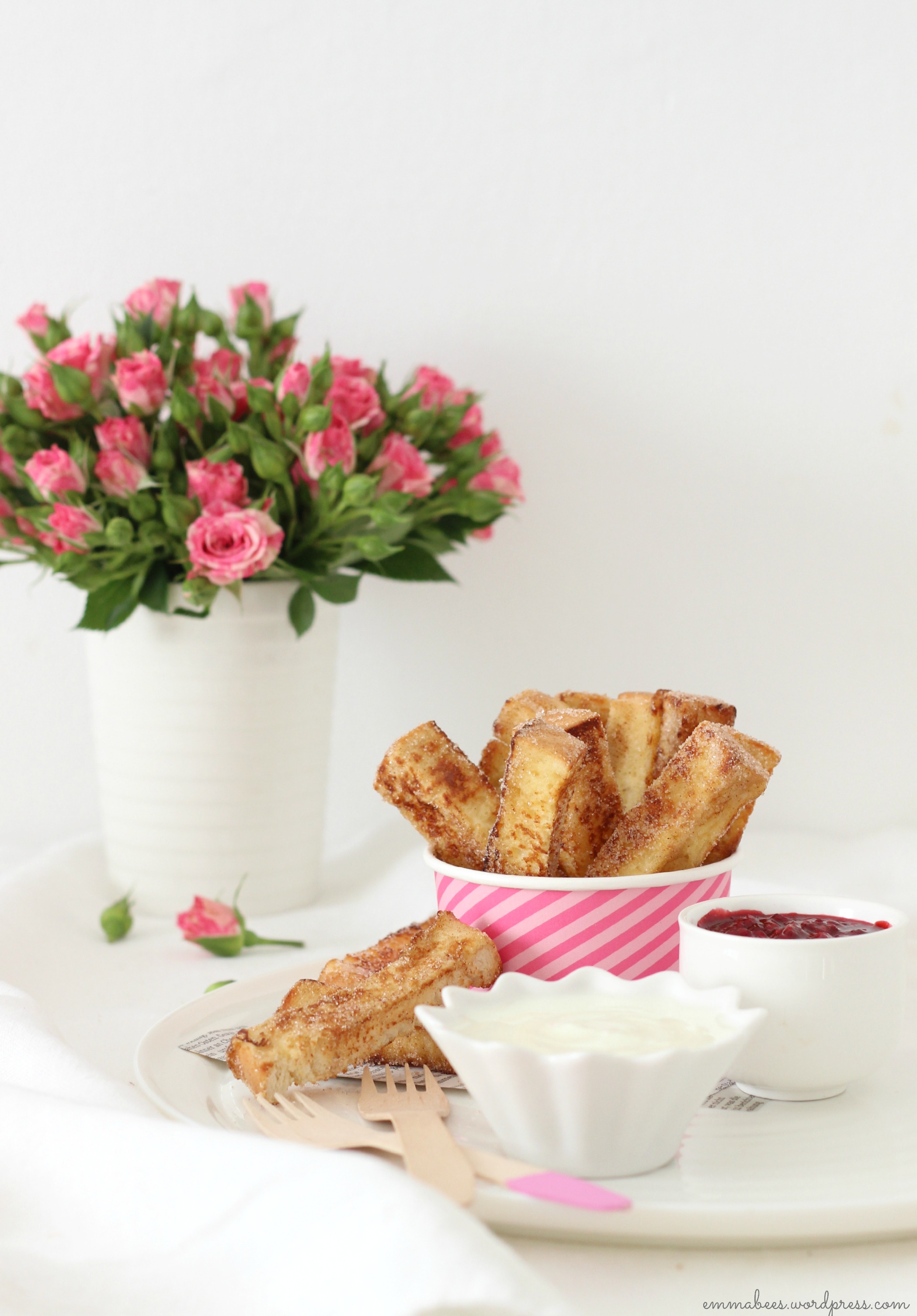 Heute auf unserem Mittagstisch: Arme Ritter in der Fingerfood Variante. Dieser kulinarische Kinderliebling geht wohl immer, und über die Pommes-ähnliche Zubereitungs-Variante bin ich kürzlich auf einem meiner Pinterest-Streifzüge gestoßen. Und heute war genau der richtige Augenblick für Arme Ritter mit Vanille-Joghurt und Himbeer-Soße. Also schnell noch ein Alibi-Süppchen gekocht um sich dann an den Nachtisch zu machen…