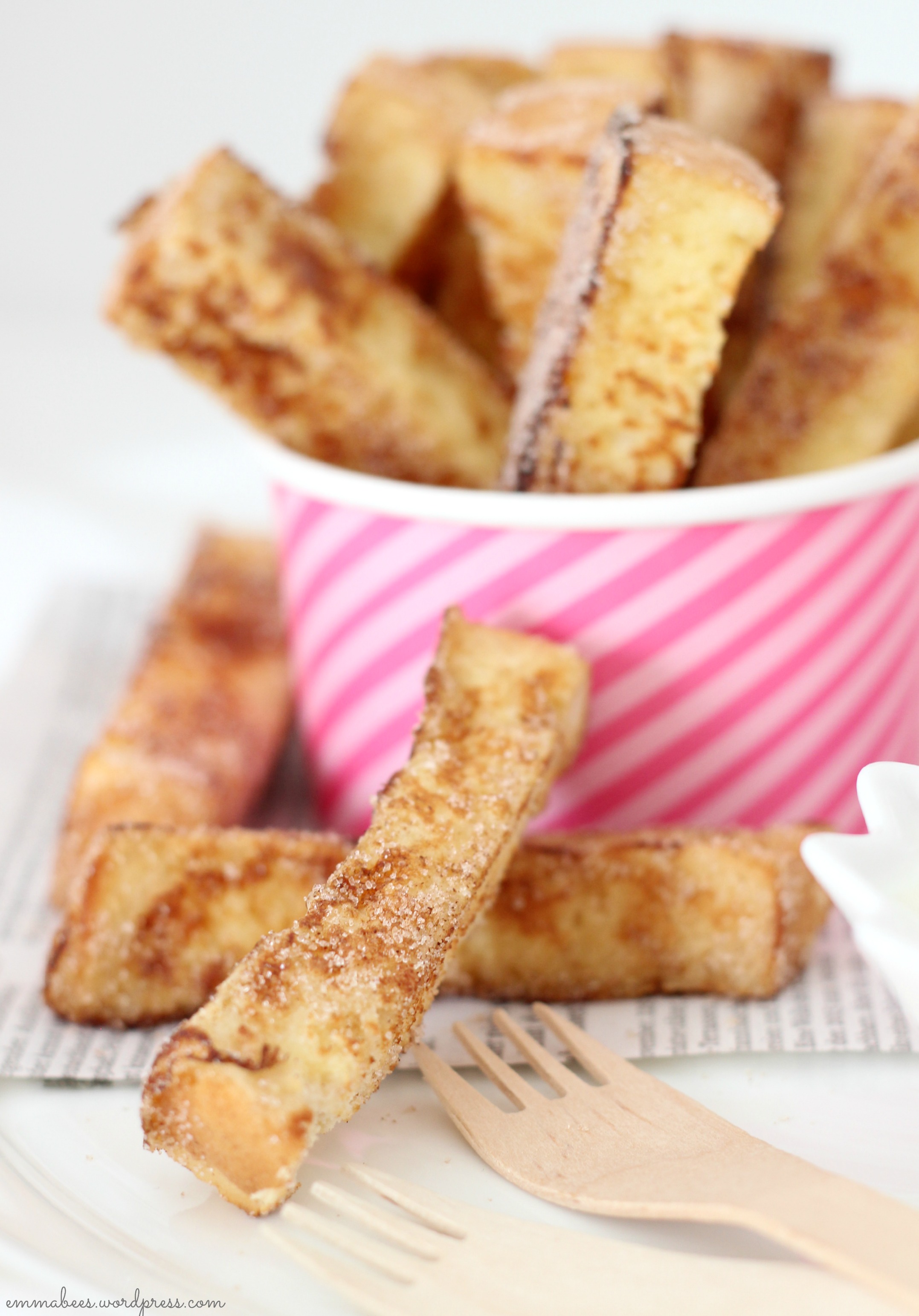 Weißbrot in pommesähniche Streifen schneiden. Auf einem flachen Teller ca. 30 g Zucker und 1/2 TL Zimt vermischen und beiseite stellen.